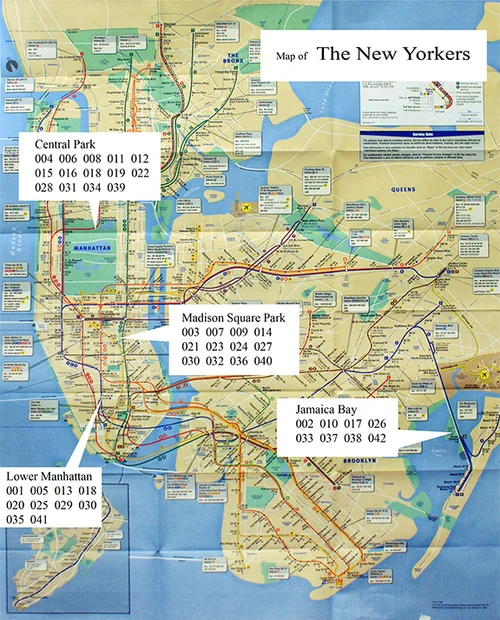 ニューヨークに半世紀、芸術家として制作を続けて来ました。ニューヨーカーには種々の生き物がいて、それぞれにユニークでカラフルな興味深い生活を続けています。これらの無限のニューヨーカーたちを今日も描き続けています。それぞれの場所を示す地図があります。