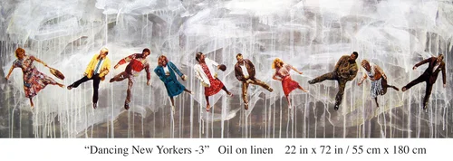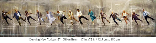 Dancing New Yorkers-1: Oil on linen, 22 in x 72 in /55 cm x 180 cm
